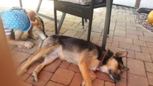 Seitdem warte ich ohne knurren und Haare stellen auf die kleinen Biester und hoffe, dass sie Zeit haben mit mir zu spielen! Aber nur unser Enkelkind Samuel ist mein bester kleiner Kumpel. Wir spielen so gerne zusammen Auto und Ball und er guckt immer, ob ich alles habe. Zum Beispiel Wasser, Futter, Bett usw. Wir teilen uns die Johannisbeeren und trampeln uns im Efeu eine Höhle.... das ist toll! Er hat mich neulich auch untersucht und mir gesagt, dass gesundheitlich bei mir alles o.K. ist.
