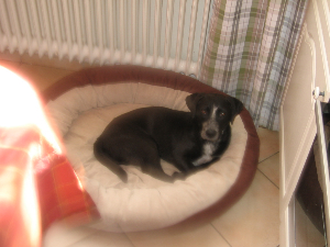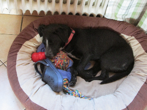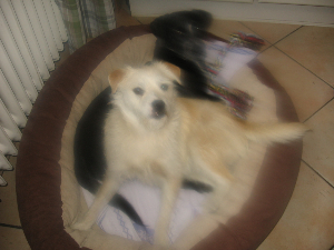 Ja, die beiden sind schon ein hübsches Gespann wenn auch mit allen Wasser gewaschen. So haben sie gleich am ersten Abend schon den ersten Kuschelkorb zerlegt, unsere Terrassentür wo die Hundeklappe drin ist, (was aber nichts macht, weil bei uns nichts wertvoll und neu ist) und an den Schuhen knabbern sie auch sehr gerne herum. Bis jetzt ist noch kein Schuh zerlegt worden, nur mal nach draußen in den Regen geschleppt. :P