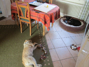 Danach habe ich mich dann startbereit gemacht und bin für ca. 1,5 Stunden weg gefahren, um noch ein wenig Kau- und Spielzeug sowie eine neue Hundebürste zu kaufen sowie nach einem neuen Läufer Ausschau zu halten den die beiden am ersten Tag versaut haben. :-) Ich denke, es ist jetzt sehr wichtig, schon mal regelrelmäßig und auch für länger die Hunde alleine zu lassen damit sie es lernen. Als ich wieder zurück kam, hatten sie nur meine Jacke vom Haken gerissen, etwas Sisal vom Kratzbaum abgerissen und einen Trockenstrauß zerpflückt. Scheinbar können die beiden noch schlecht damit umgehen wenn ich weg bin und sind ganz aus dem Häuschen wenn ich dann wieder komme was ich nicht belohne sondern ignoriere. Da ich beiden jeder einen Büffelhautknochen gegeben hatte als ich weg fuhr, machten sich beide vor lauter Freude über mein Erscheinen wieder über den Rest her. Dadurch haben sich beide auf einmal ganz gehörig gestritten und es gab "Beißerei" die mir wirklich angst gemacht hat. Da war wirklich was los... . Es ist aber zum Glück nichts passiert. Das kostet im Moment wirklich Nerven wenn solche Dinge passieren, das muss ich schon sagen, den Katzen macht das natürlich noch mehr angst als sie schon haben. Aber da müssen sie wohl durch. Während ich hier schreibe, sitzt die Paula wieder auf ihrem Kratzbaum und putzt sich während die beiden Jungs im Korb schlafen, natürlich angebunden. Luna war gerade auch schon hier und hat sich durchs Zimmer geschlichen, weil Paul dann diesmal allerdings anfing unruhig zu werden, ist sie gleich wieder stiften gegangen. Ich hab die beiden gerade erst mal richtig gebürstet und sie haben es sichtlich genossen, beide. Das kenne ich von meinen vorherigen Hunden gar nicht. Sie haben es gehasst. :-)