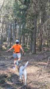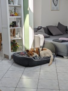 Sie hat sich super gut eingelegt, sich ein schönes Bettchen im örtlichen Tierladen ausgesucht und erholt sich seit dem seelenruhig von unseren großen Spazier- und Laufrunden. Über Wald und Wiesen, durch Bäche und Flüsse sind wir schon gejoggt, Seite an Seite. Manchmal auch hintereinander, wenns eng wird.